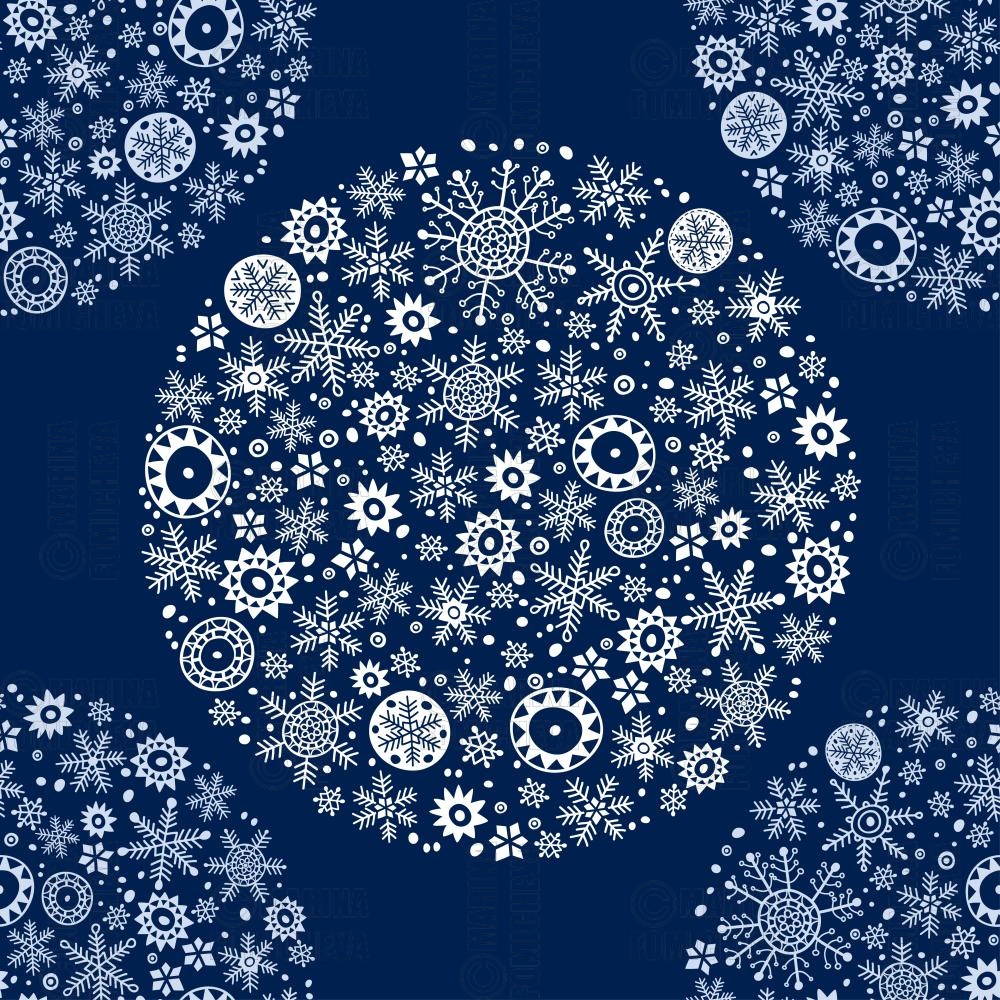 冬季手绘图案,采用传统白蓝配色。圆形构图由形状各异、细节分明的雪花组成,艺术家巧妙融合了不同尺寸的几何元素。中心区域的大型雪花线条精雕细琢,周边环绕着直径更小的装饰性冰晶。图案中回环的装饰纹样颇具趣味,其内层纹路呈现出冬日窗棂的冰花意象。细密圆点妥善填充主体图形间隙,赋予整体灵动的虚空感。主圆边缘复现同类图案,强化视觉统一性。每一枚雪花都独具特质且细节考究。饱满的深蓝色基底上,清晰的白色线条塑造出强烈视觉对比。韵律性的纹样重复带来纷纷扬扬的雪花舞动之感。图案质感神似剪纸工艺或传统民间刺绣。适用于节日纺织品、新年贺卡、礼盒包装纸、陶瓷器皿、壁纸等冬日家居装饰领域。