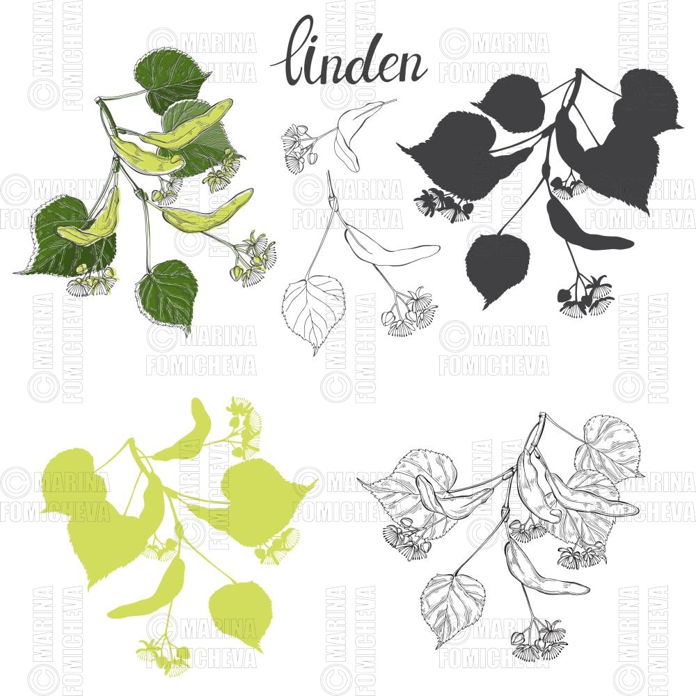 椴树(linden)的植物图解,采用多种艺术风格绘制。画面呈现了四幅椴树枝条的变体,均具有标志性的心形叶片和花序。左上角为全彩版本,展现自然绿色的叶片与浅黄色果实,清晰勾勒出叶脉和质感的细微之处。其右侧以书法字体写着植物名称“linden”。旁边为同一枝条的黑色剪影版本,突出强调植物的形状与结构。底部还有两幅变体:左侧为浅绿色的单色版本,右侧为对细节精心描绘的轮廓图。每幅插图都呈现出椴树自然姿态的优雅美感,充分展现了植物画师的艺术造诣。该插图非常适合用于植物图鉴、科学出版物、天然化妆品包装、茶叶外包装、植物图案纺织品,以及植物学教学材料。